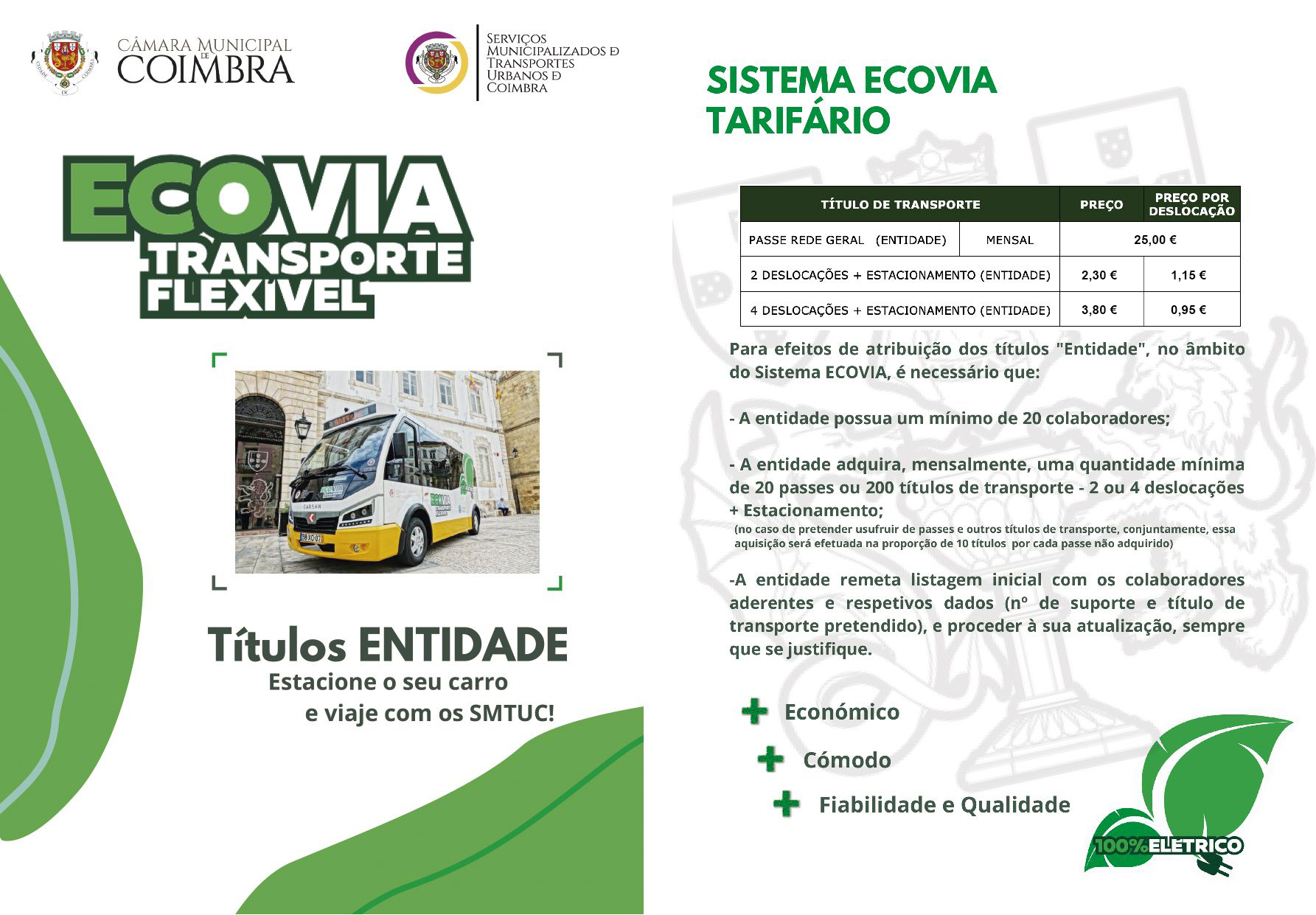 Estes títulos de transporte são igualmente válidos para toda a rede de transportes SMTUC, conferindo o direito ao estacionamento gratuito nos parques afetos a este sistema.